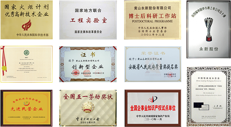 全國五一勞動獎狀;國家創(chuàng)新型企業(yè);中國創(chuàng)新型企業(yè)100強;中國包裝龍頭企業(yè);中國包裝優(yōu)秀示范品牌;國家首批資源節(jié)約型環(huán)境友好型試點企業(yè);全國就業(yè)與社會保障先進民營企業(yè);國家火炬計劃重點高新技術(shù)企業(yè);中國中小企業(yè)板上市公司50強;全國守合同重信用企業(yè);全國先進包裝企業(yè);全國企事業(yè)單位知識產(chǎn)權(quán)試點單位;全國輕工業(yè)先進卓越績效企業(yè);海關AA級企業(yè);中國醫(yī)藥包裝優(yōu)秀單位;安徽省人民政府質(zhì)量獎提名獎