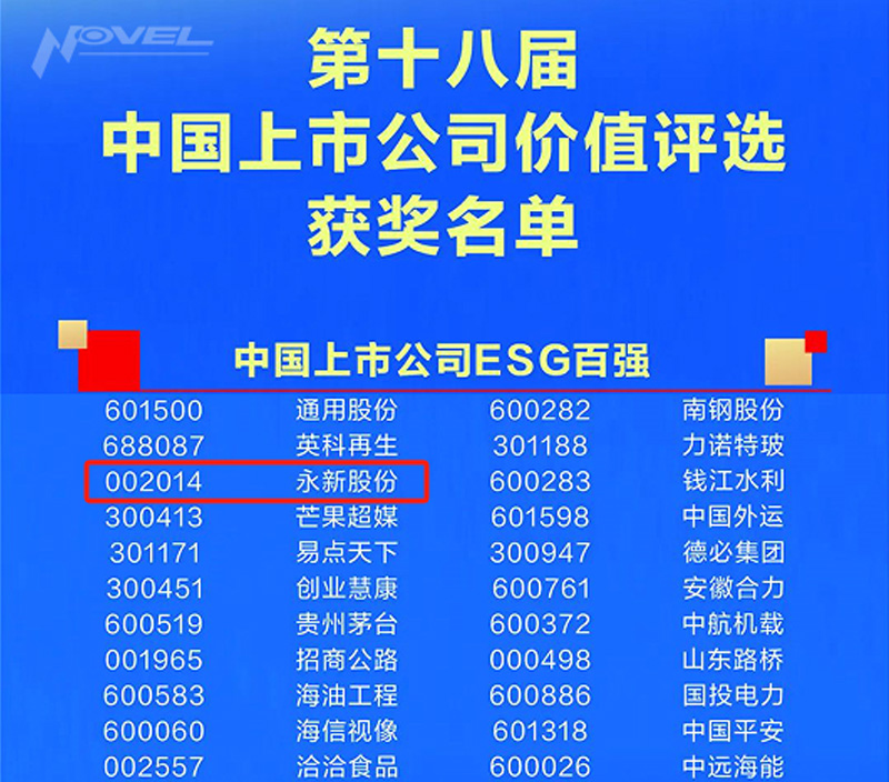 永新股份獲得第十八屆中國上市公司價值評選 “中國上市公司ESG百強”稱號
